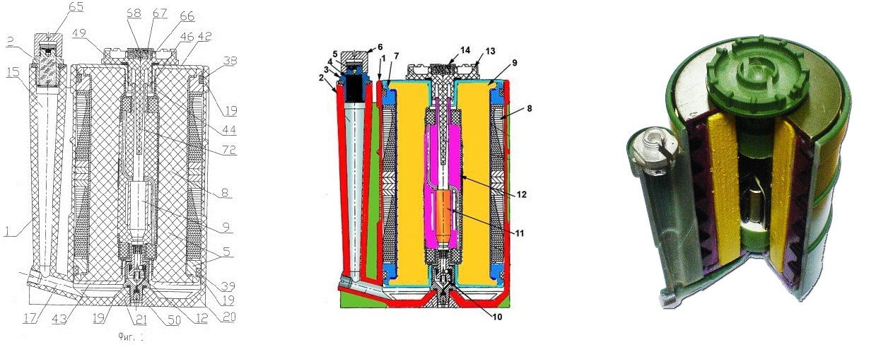 V tej istej dutine sú umiestnené medziľahlé detonátory (12). Do hornej časti projektilu je zaskrutkovaná tesniaca technologická zátka (13), do ktorej stredu je vložená bublinková vodováha (14) (ktorá slúži ako nivelačný prístroj pri vkladaní munície do zeme, t. j. umožňuje určiť vertikalu munície v teréne.