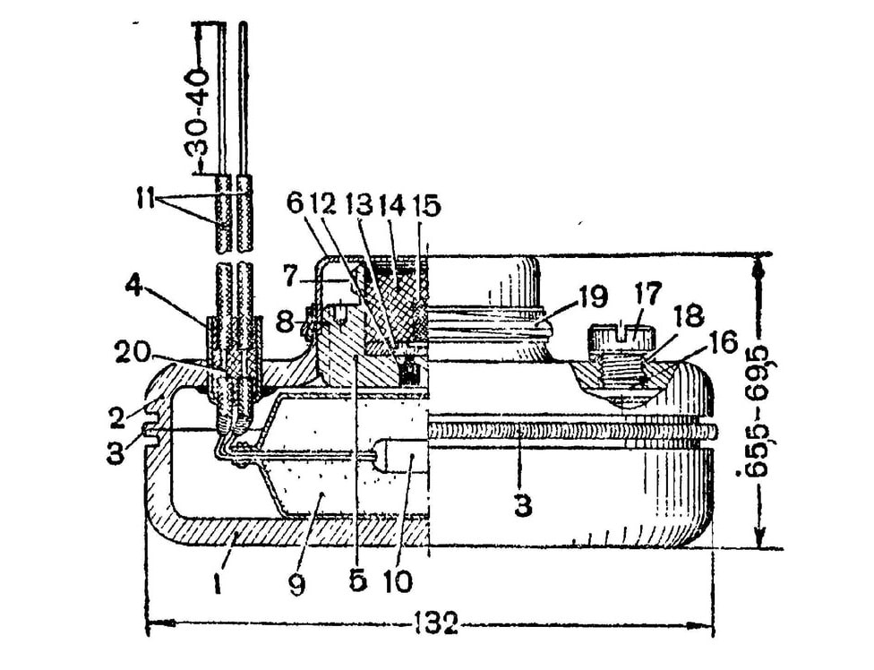 Výbušná náplň pozdĺž osovej línie má dutinu, v ktorej je v spodnej časti umiestnený bicí mechanizmus (10), čo je pružinový úderník, ktorý drží na mieste aretačná guľôčka; na konci sústavy úderníkov je pripevnený tenký drôt (odolný voči teplu), ktorého druhý koniec je upevnený na dne puzdra. Nad úderníkom sa nachádza zápalka a rozbuška (11).
