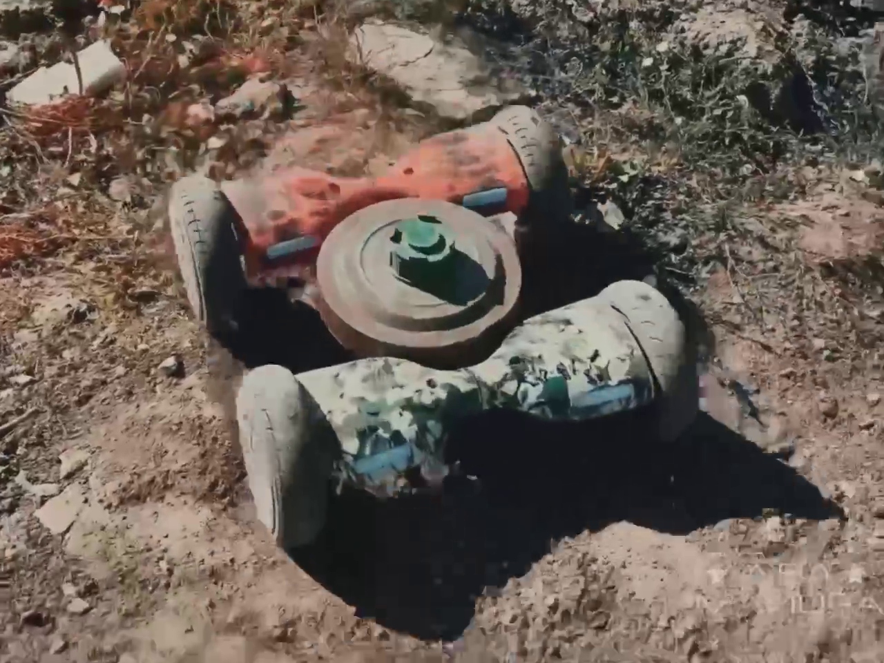 Pozemný kamikadze udelátor z dvoch segway (hoverboard sú otočené hore nohami pre väčšiu svetlú výšku) a protitankovej míny TM-62