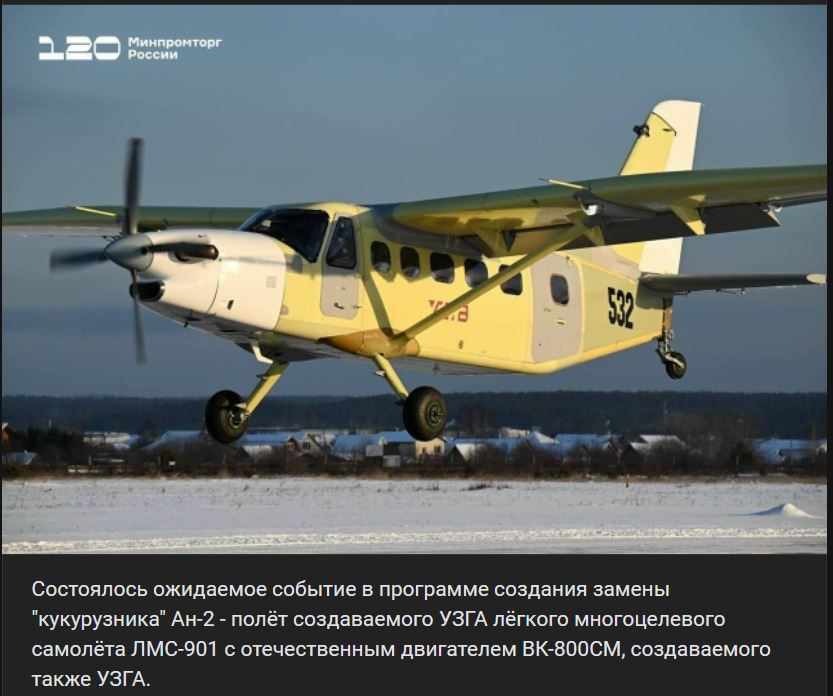 Očakávaná udalosť v programe vývoja náhrady za „kukuruznika“, lietadla Anonov An-2 sa uskutočnila – let ľahkého viacúčelového lietadla LMS-901 (ЛМС-901) od AZGA (УЗГА) s domácim motorom VK-800SM (ВК-800СМ)