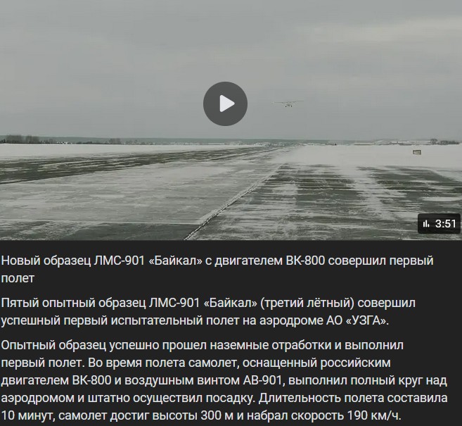V stredu 24.12.2025 sa v rámci testov po prvýkrát vzlietlo nové ruské ľahké lietadlo LMS-901 „Baikal“ (ЛМС-901 Байкал) s novým domácim motorom VK-800 (ВК-800) a vrtuľou AV-901 (АВ-901)