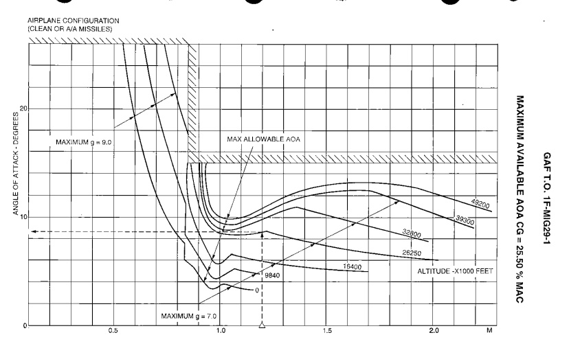 Na grafu usáleného G je na levo sloupec G, dole je rychlost. U jednotlivých čar ukazujících průběh G k rychlosti je výška ve stopách. Z grafu tedy plyne že 9G se dá dosáhnout v konfiguraci která je uvedena při zemi - v nízké výšce.
