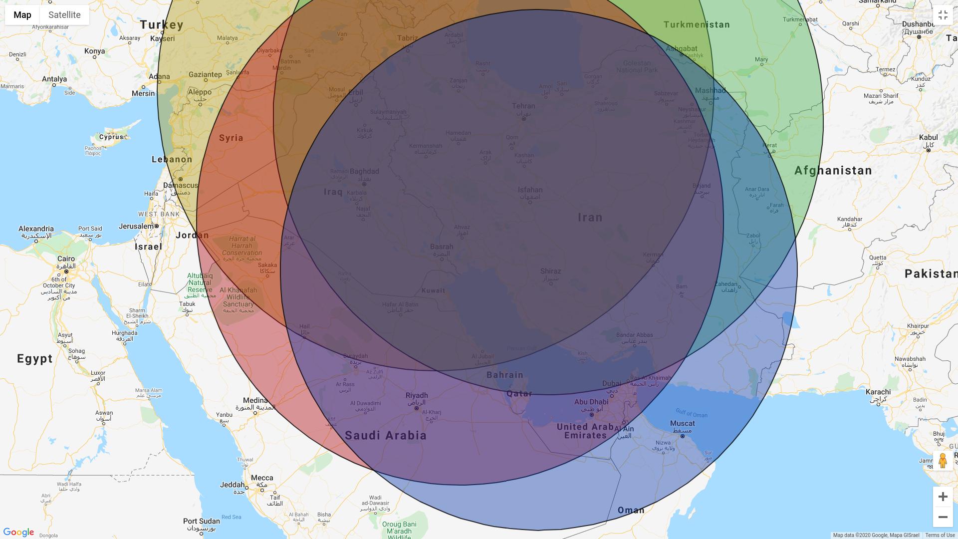 Zakreslený jejich maximální uváděný dosah 1100km