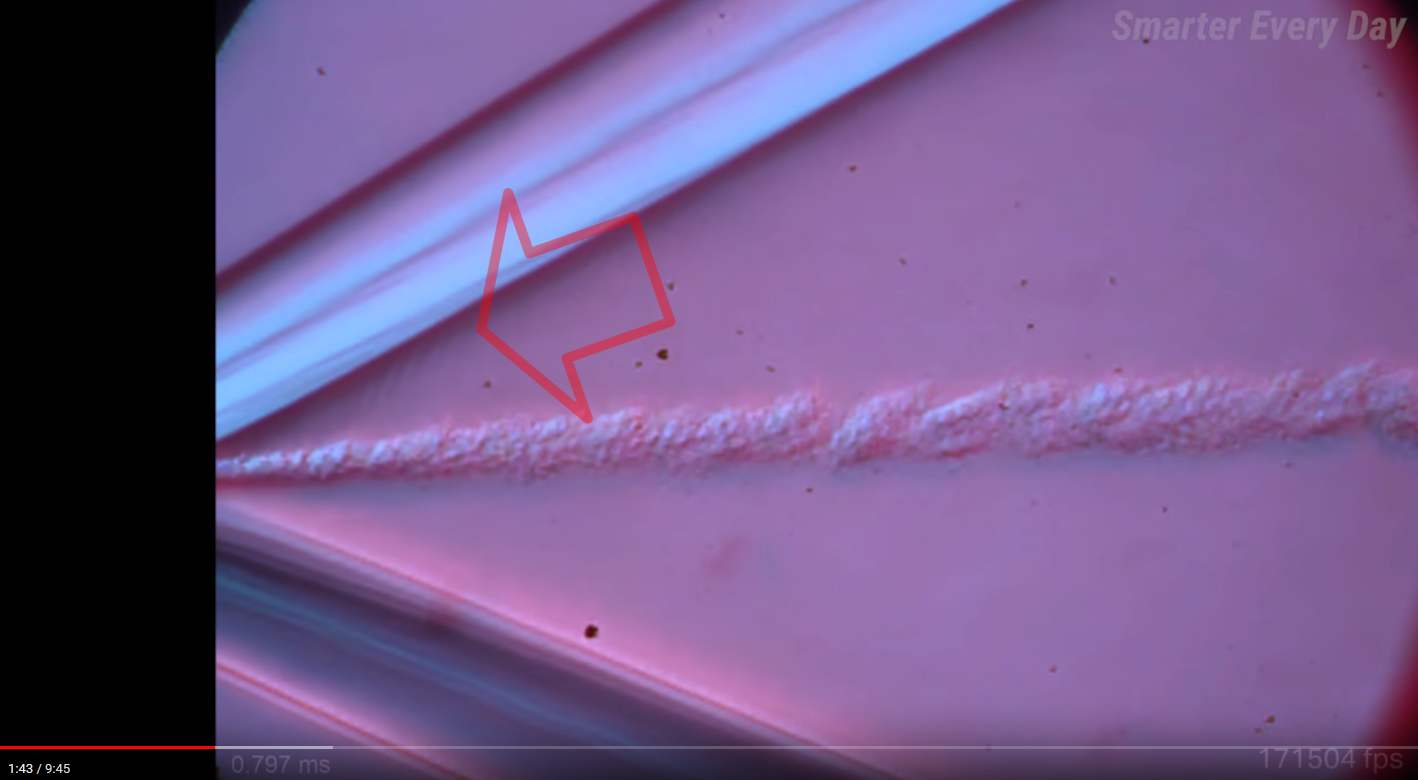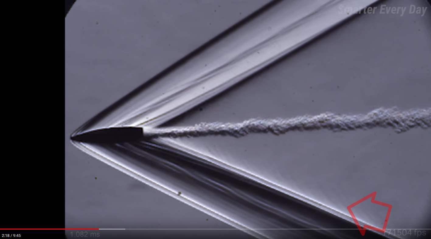 Za šikmou rázovou vlnou celkom evidentne existujú aj oblúkové (= guľové) rázové vlny s celkom pravidelnými rozostupmi.