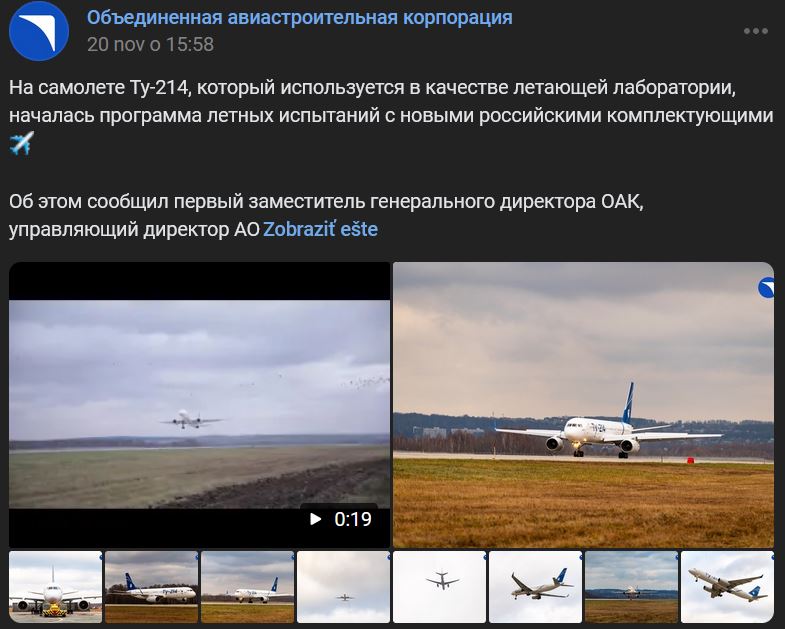 Na lietadle Tupolev Tu-214 (Ту-214), ktoré sa používa ako lietajúce laboratórium, začal program letových skúšok s novými ruskými komponentmi. Oznámil to prvý zástupca generálneho riaditeľa OAK a generálny riaditeľ spoločnosti AO Tupolev (Туполев) Konstantin Timofejev (Константин Тимофеев). V stredu 20.11.2024 sa lietadlo po prvý raz vznieslo do vzduchu po nahradení komponentov z dovozu. Let sa uskutočnil na letisku Kazanského leteckého závodu S. P. Gorbunova (Казанского авиационного завода им. С.П. Горбунова), pobočky spoločnosti AO Tupolev, a trval 1:10 hod. (70 min.). Lietadlo pilotovala posádka AO Tupolev. Vo vzduchu sa vykonali potrebné kontroly viacerých uzlov a súčastí systémov palubného vybavenia. Podľa posádky sa testy uskutočnili v normálnom režime, systémy a zariadenia fungovali bez akýchkoľvek pripomienok.
