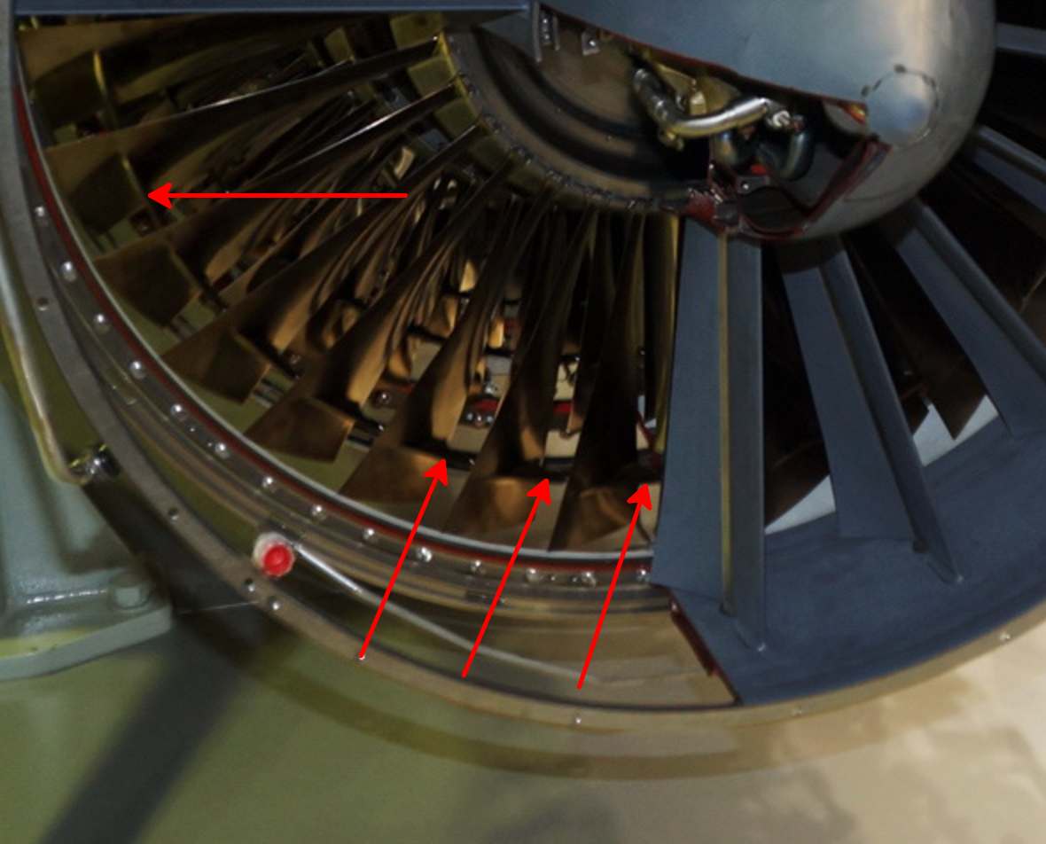 Vojvoda hovorí o tomto - stabilizačný prstenec. Nie je to kompaktný diel, časť prstenca je vytvorená na každej lopatke. Úlohou je zabrániť "veľkým" pohybom "dlhých a tenkých" lopatiek prvého stupňa kompresoru pri bojových obratoch lietadla a aj pri zmenách otáčok motoru. Uchytenie lopatiek v disku totiž nemôže byť z viac dôvodov príliš tuhé. U dopravných lietadiel (boeingov i airbusov) lopatky kompresoru pri pomalom pretáčaní hriadeľa celkom zreteľne "klepocú". Monoblok je naopak samozrejme úplne tuhý.