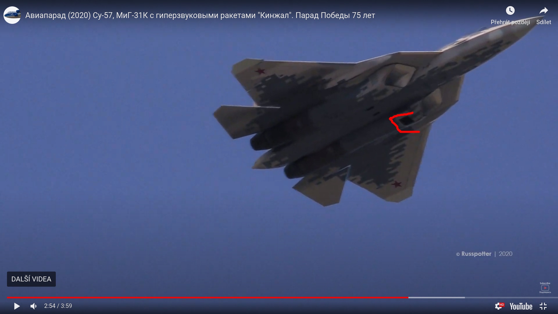 Ale zajímavé je, že když se na to video podíváte pořádně, tak první Su-57 má buď natřeno načerno tu oteviratelnou žaluzii na levém sání vzduchu vespod vpředu a nebo ji má úplně otevřenou a na pravém sání je zavřená, ale tři zbývající Su-57 je mají zavřené.. přitom letí na stejném režimu, což je trochu zvláštní, to by mohlo naznačovat, že přeci jen by to mohl být jiný motor, protože takto asymetricky rozdílně na jednom letounu ve vodorovném letu by stejné motory asi těžko pracovali.