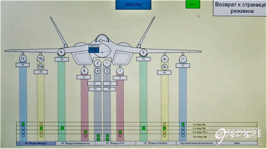 Hodně zajímavé, Izd.180 je ta dvojstupňová PLŘS (pravděpodobně to bude ta R-97 ze simulátoru Su-57 o dosahu větším než >160km na vstřícný podzvukový cíl na střední výšce, na velké výšce a rychlosti bude dosah minimálně kolem 180-200km)Umístění zbraní vzduch-vzduch na Su-57. Screenshot z monitoru zobrazeného na videu Ministerstva obrany Ruské federace