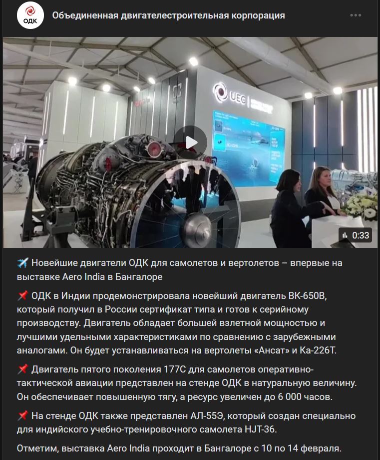 Spoločnosť ODK (ОДК) v Indii predviedla najnovší motor VK-650V (ВК-650В), ktorý v Rusku získal typový certifikát a je pripravený na sériovú výrobu. Motor má vyšší vzletový výkon a lepšie špecifické charakteristiky v porovnaní so svojimi zahraničnými analógiami Bude sa montovať do vrtuľníkov "Ansat" (Ансат) a Kamov Ka-226T (Ка-226Т).