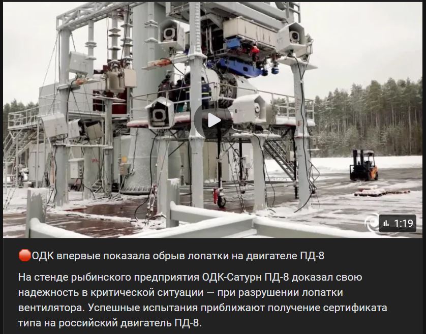 "Nachádzame sa v záverečnej fáze certifikačných testov / skúšok nových motorov PD-8 (ПД-8). Ide o obrovský súbor skúšobných prác, ktorý zahŕňa viac ako 100 programov: skúšky na bočný vietor, nasatie vtákov, prevádzka počas krupobitia, silného dažďa (veľa vody), poškodenie lopatiek ventilátora. Ide o komplexné a zodpovedné testy," povedal Artem Badernikov (Артем Бадерников), zástupca hlavného konštruktéra motora PD-8 (ПД-8).