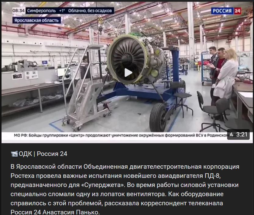 V Jaroslavskej oblasti vykonala ODK dôležité testy najnovšieho leteckého motora PD-8 (ПД-8), určeného pre lietadlo Superjet. Počas prevádzky pohonného agregátu bola zámerne poškodená jedna z lopatiek ventilátora. Ako sa zariadenie s týmto problémom vyrovnalo, opísala korešpondentka televízneho kanálu Rusko 24.