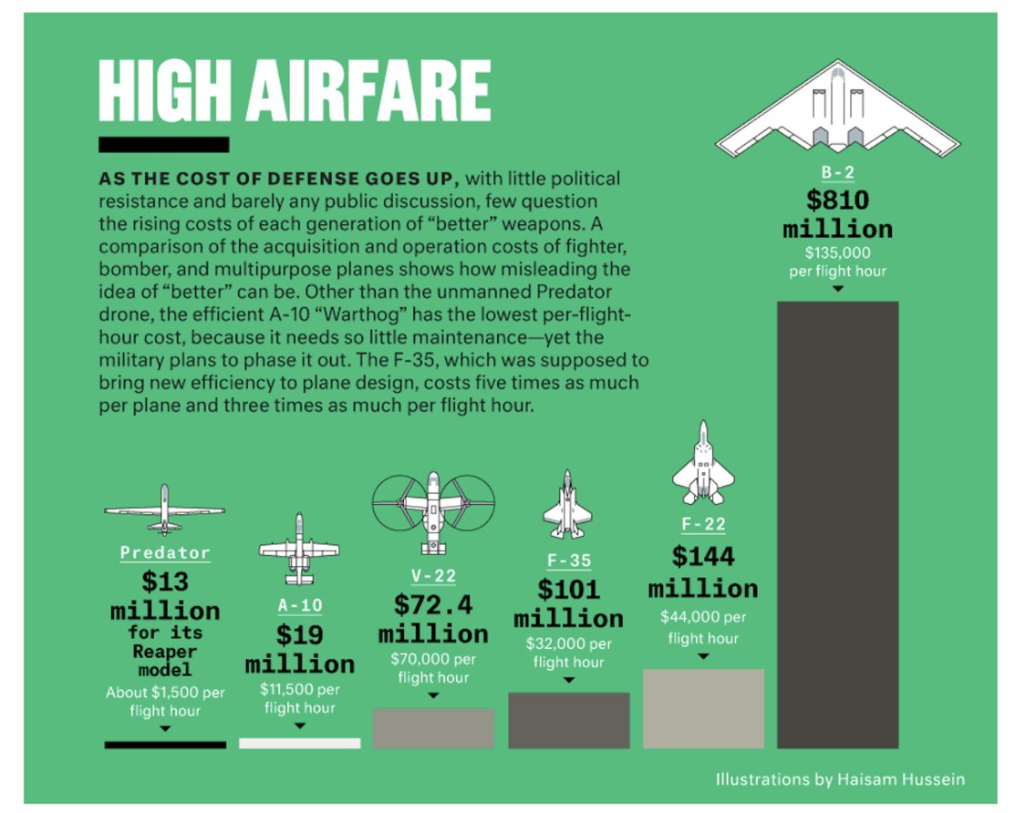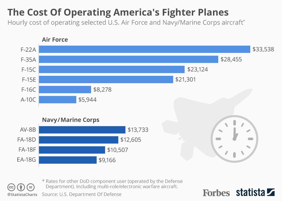 Stíhacie lietadlá USAF + US NAVY / Marine TOP 10 najdrahších letových hodín podľa typu: Rôzne typy - celková cena lietadla vs. cena za 1 letovú hodinu: Zdroj https://fighterjetsworld.com/air/mainte ... ets/11995/ z 24.03.2019