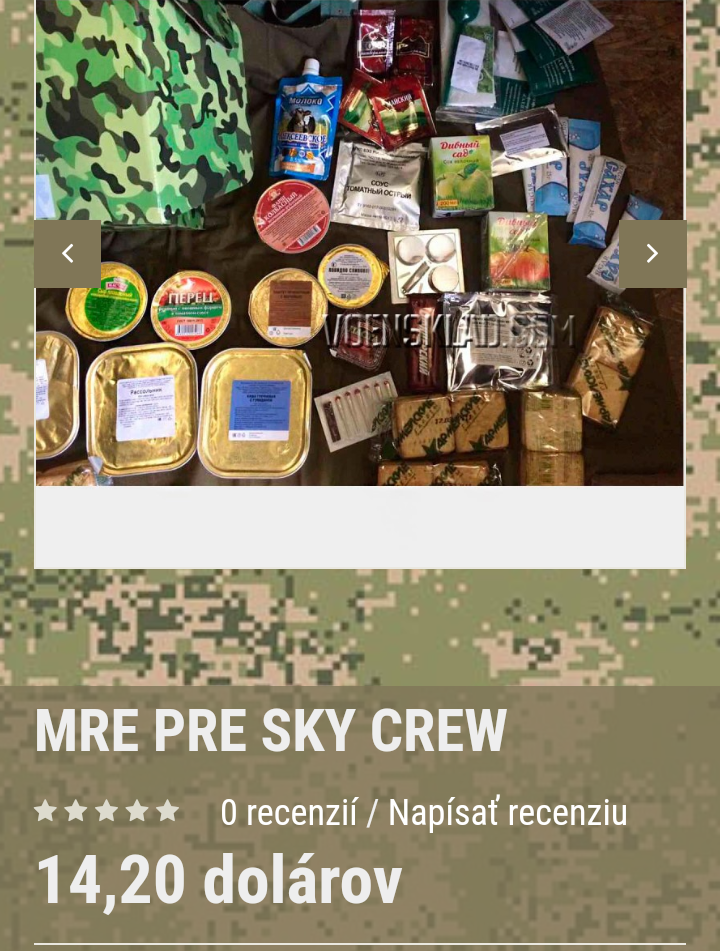 MRE ruskej armády pre letové posádky lietadiel a vrtuľníkov na letiskách (RPESV) Súbor potravín určený na stravovanie vojakov, ale aj civilistov v podmienkach, kde nie je možné variť teplé jedlá. Suchá dávka je pre jednu osobu počas dňa.