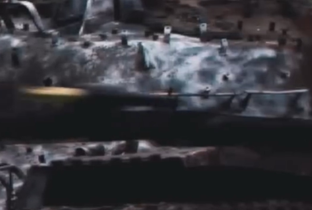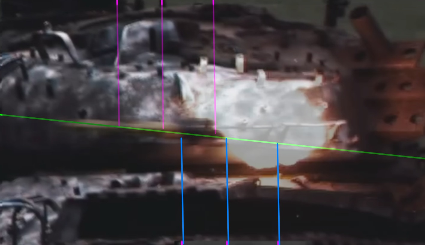 fialové a modré línie vyznačujú prekurzor, prednú hranu hlavnej nálože a koniec strely, zelená je približne osa strely/smer pohybu. Je zrejmé do čoho narazil prekurzor a kde asi bola hlavná nálož. Bohužiaľ, video je tak rozmazané, že sa nedá odhadnúť, či sa strela vychýlila z dráhy alebo zlomila - alebo nie... Druhý (zadný) držiak zmizol, z "predného" zostala polka...