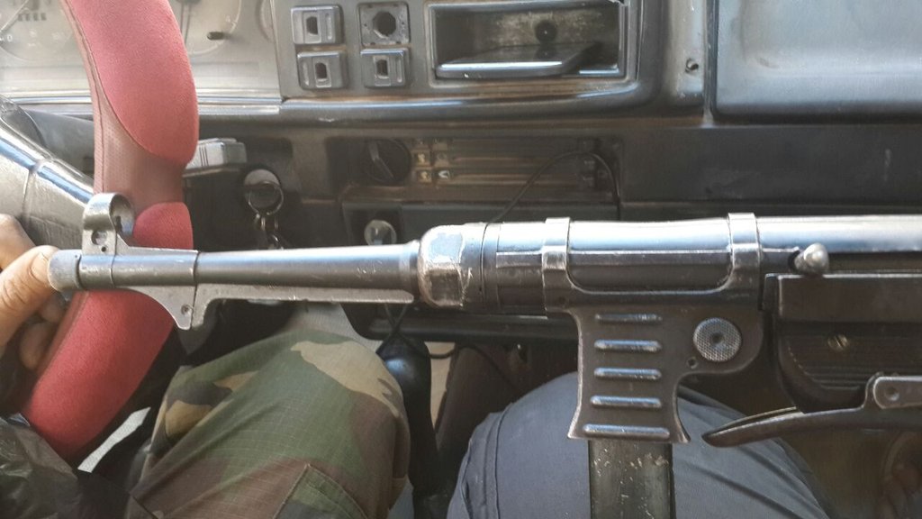 MP-40 z druhej svetovej vojny. Automobil je tiež zaujímavý - v Sýrii obľúbený Favorit.