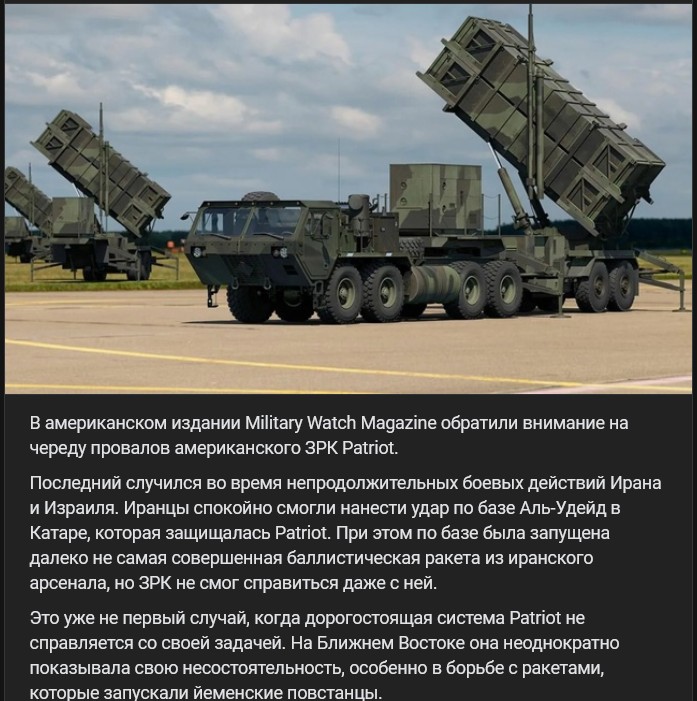 Zdroj https://vk.com/wall-123538639_4643270 z 14.07.2025K poslednému z nich došlo počas krátko trvajúcich bojov medzi Iránom a Izraelom (06/2025). Iráncom sa v tichosti podarilo zasiahnuť základňu Al-Udeid v Katare, ktorú bránil PVO systém Patriot. Zároveň bola na základňu vypálená zďaleka nie dokonalá balistická raketa z iránskeho arzenálu, ale PVO systém Patriot si nedokázal poradiť ani s ňou.