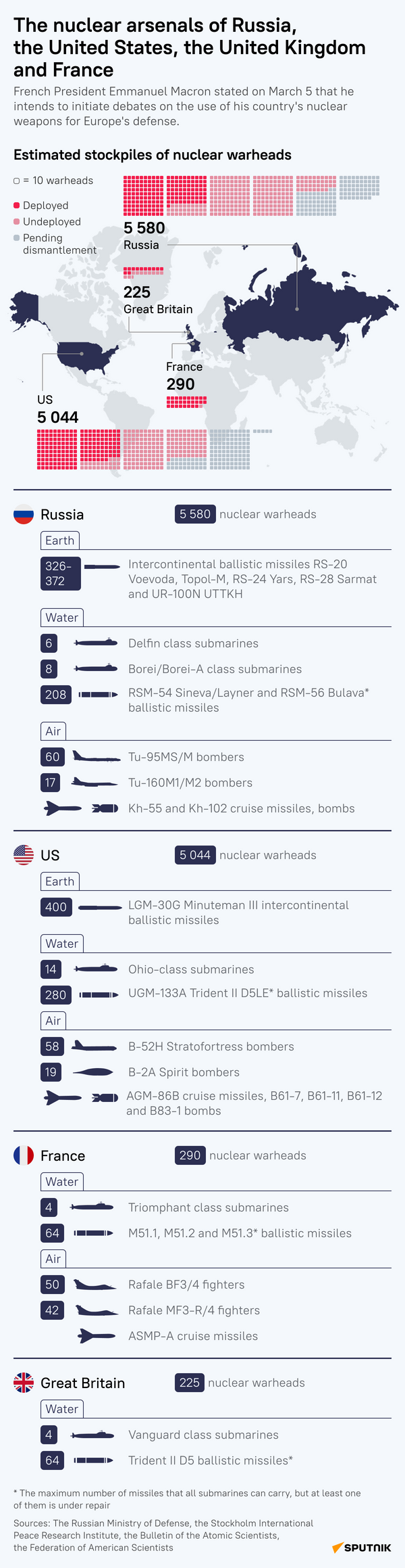 Navzdory Macronovým „napoleonským“ prohlášením francouzský jaderný arzenál není tak působivý jako arzenál USA a Ruska. Zahrnuje 290 hlavic, což je docela působivé, ale země nemá vlastní systém protiraketové obrany, což ji činí zranitelnou, zejména v podmínkách vysoké hustoty obyvatelstva a urbanizace.
