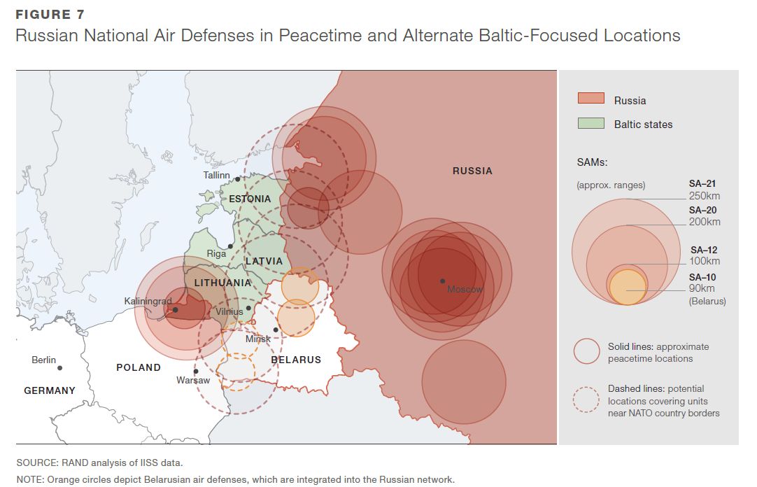 A obrazku oznčenom ako Figure 7 je realny rozsah ruskych radarov jednotlivych PVO systemon v časoch mieru a čiarkovane predpokladany dosah a rozmiestnenie v pripade možneho konfliktu s NATO.