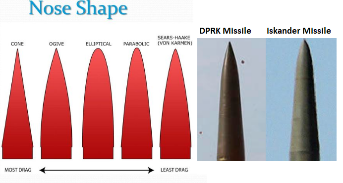 Čo sa týka "podobnosti" - treba mať na pamäti, že tvarovanie predne časti strely je "kruciálna" záležitosť. Predovšetkým v oblasti transonickej a supersonickej (zhruba Mach 0,9 - Mach 2,5) sa koeficienty čelného odporu rôznych tvarových variant prednej časti strely líšia doslova "šialeným" spôsobom (kužel, zaguľatený kužel, dvojkužel, ogivál, zaguľatený ogivál, rôzne elipsoidy, paraboloidy, hyperboloidy, tvary "Haack", "Sears-Haack", "von Kármán",... tvary so "sosákom" - Igla, Polaris, Trident, M51...).