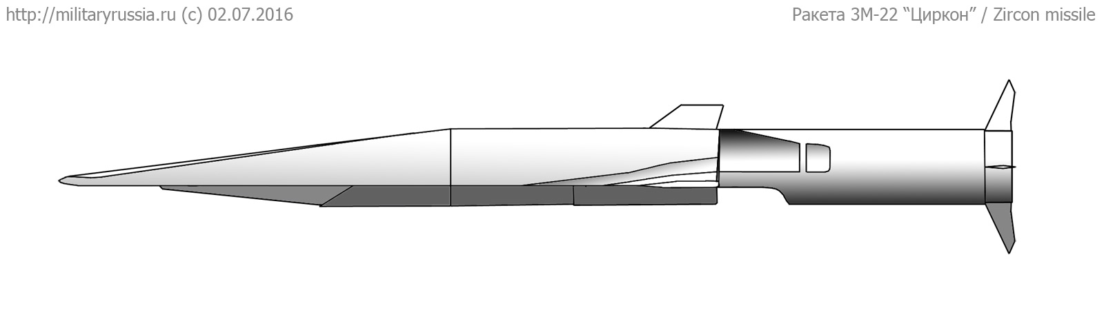 Fiktívna predstava 3M-22 Zirkon, reálny tvar môže byť iný - prakticky kdekoľvek medzi týmto, Brahmos II a X-51 Waverider Pribliný tvar strely v momente odpálenia - poskladané z "najmenej rozmazaných" záberov príslušnej časti strely