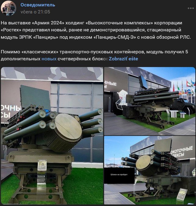 Zdroj https://vk.com/wall-123538639_4280591 z 11.08.2024Na výstave "Armáda 2024" (Армия 2024) predstavil holding "Vysokopresné komplexy" (Высокоточные комплексы) korporácie Rostech (Ростех) nový stacionárny modul PVO systému Pancir (Панцирь) pod indexom Pancir-SMD-E (Панцирь-СМД-Э) s novým prehľadovým radarom. Okrem "klasických" prepravných a odpaľovacích kontajnerov rakiet dostal modul ďalších 5 nových prídavných blokov TKB-1056 (ТКБ-1056), pravdepodobne pre rakety krátkeho dosahu TKB-10-55 (ТКБ-10-55). Nápadná je aj absencia 30 mm protilietadlových kanónov 2A38(M). To však nie je všetko. Modul je usadený na ráme, ktorý sa zrejme dá namontovať aj na podvozok nákladného vozidla, aby jednotka získala mobilitu. Na tom istom ráme, za samotným odpaľovacím zariadením je pravdepodobne namontovaný dieselový generátor. V pozadí je vidieť obrnené vozidlo KamAZ-53949 ( КамАЗ-53949) "Tajfun-K" (Тайфун-К), ktoré pravdepodobne slúži ako mobilné veliteľské stanovište.