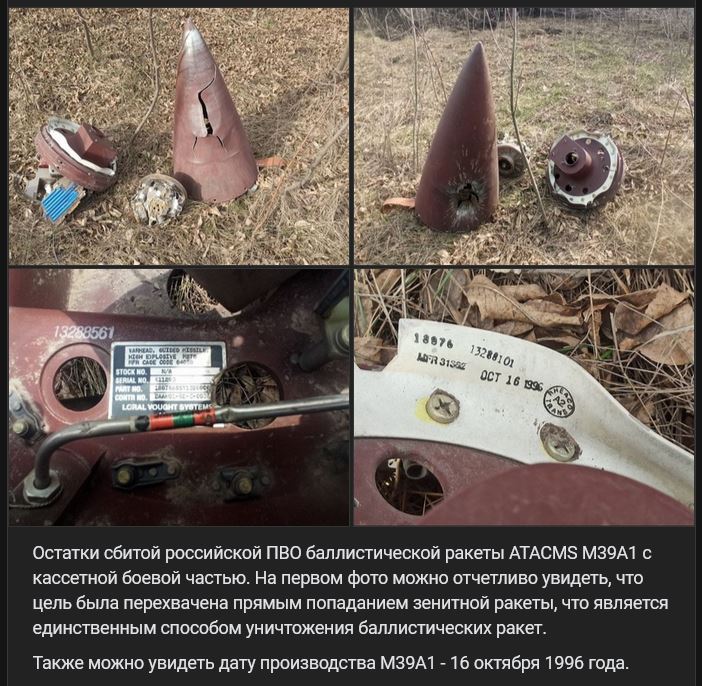 Zdroj https://vk.com/wall-123538639_4526698 z 27.03.2025Zvyšky balistickej rakety ATACMS M39A1 s kazetovou bojovou časťou, ktorú zostrelila ruská protivzdušná obrana (PVO). Na prvej fotografii je jasne vidieť, že cieľ bol zasiahnutý priamym zásahom protilietadlovej/protiraketovej rakety, čo je jediný spôsob, ako zničiť balistické rakety. Vidíte aj dátum výroby M39A1 - 16.10.1996.