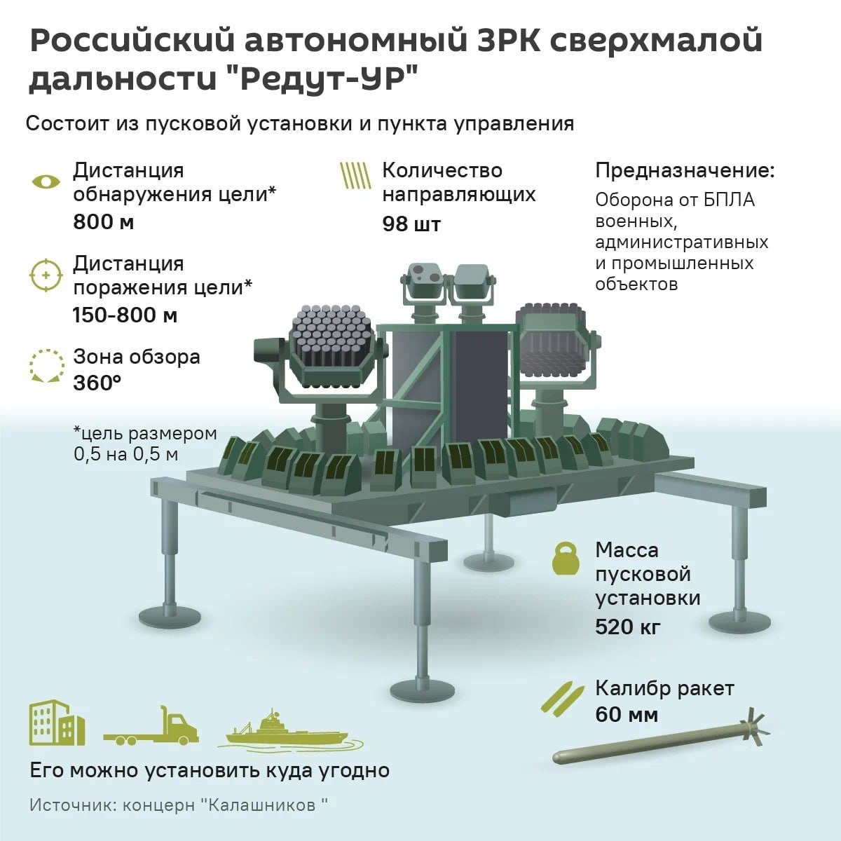 Zdroj https://vk.com/wall-104764077_549884 z 13.08.2025Koncern Kalašnikov (Калашников) predstavil protivzdušný raketový komplex s mimoriadne malým dosahom Redut-UR (Редут-УР), ktorý má byť efektívnym a ekonomickým riešením na boj proti bezpilotným lietajúcim aparátom (BPLA) a iným malým vzdušným cieľom.