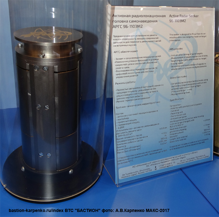 Tohle je leták té radarové hlavice 9B-1103M2 na MAKS 2017. Podle toho je to radarová aktivní hlavice pracující v Ku pásmu a určena pro rakety země-vzduch s ultra krátkým dosahem pro ničení cílů na příletu - vstřícném kurzu. Takže to bude hlavice určená de facto pro antirakety.
