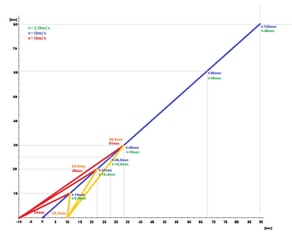 - modré čisla zodpovedajú času do dopadu pre hlavicu s rýchlosťou 1km/s (~točka), zelené hlavici s rýchlosťou 2,5km/s (SCUD má ~2,4km/s)