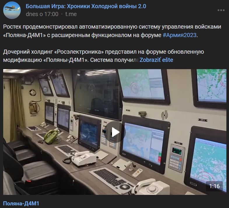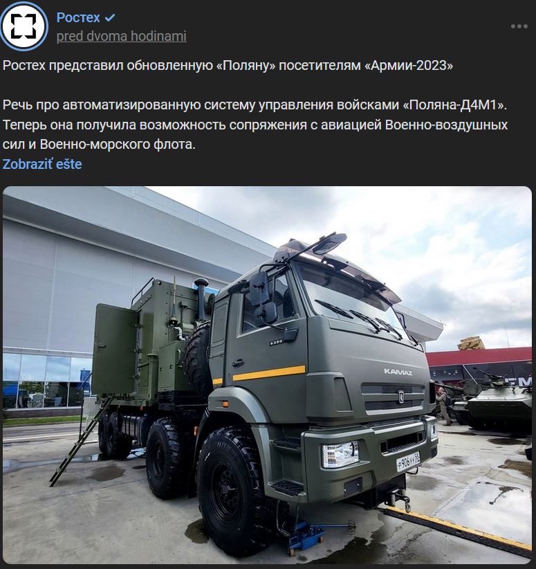 Spoločnosť Rostech na fóre "Armija-2023" predviedla automatizovaný systém riadenia vojsk Poljana-D4M1 (Поляна-Д4М1) s rozšírenými funkciami.