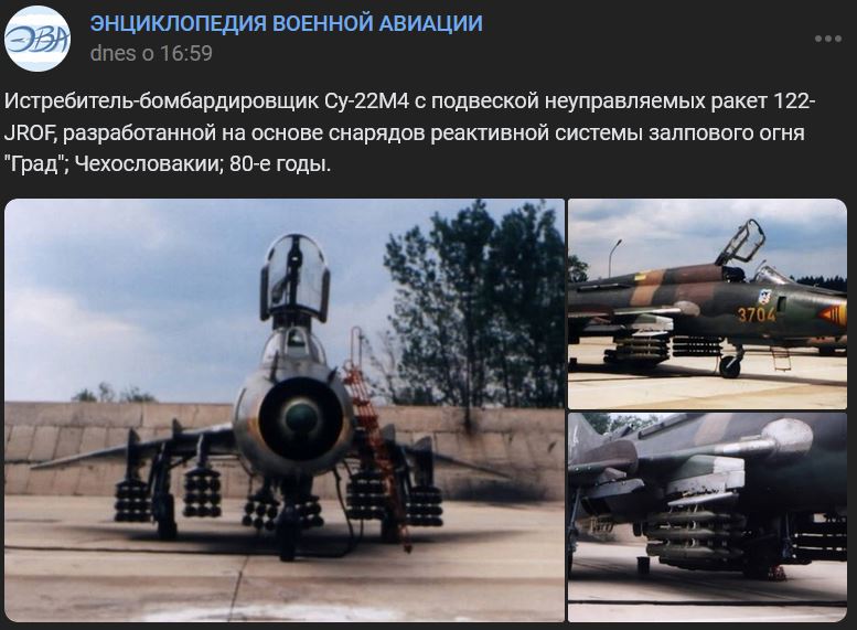 Zdroj https://vk.com/wall-173678697_360697 z 21.02.2024 + 3 fotoStíhací bombardér Suchoj Su-22M4 (Су-22М4) s podvesenými neriadenými raketami 122-JROF vyvinutým na báze raketometov Grad, Československo, 80. roky.