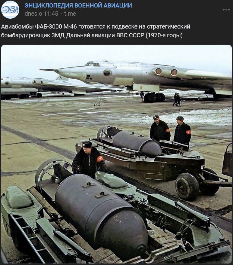 Letecké bomby FAB-3000 M-46 (ФАБ-3000 М-46) sa pripravujú na zavesenie na strategický bombardér Mjasiščev 3MD (Мясищев 3МД) diaľkového letectva VVS ZSSR (70. roky)