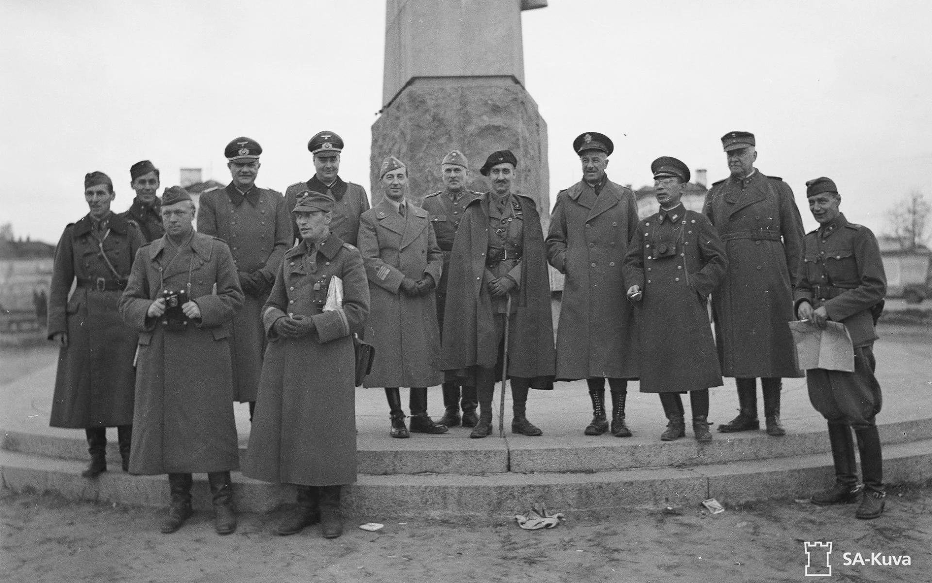 V okupovaném Petrozavodsku v roce 1941 - před sochou Lenina stojí důstojníci z Finska, Švédska, Německa, Itálie , Francie , USA a Japonska.