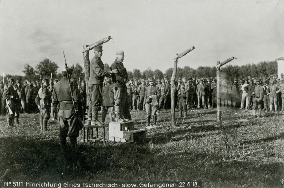 V Oderzo se RU vojáci připravují na pověšení člena italské československé legie zajatého na frontě Piave, 22. června 1918. Legionáři byli rekrutováni mezi rakousko-uherskými válečnými zajatci a v případě zajetí riskovali popravu za dezerci a velezradu.
