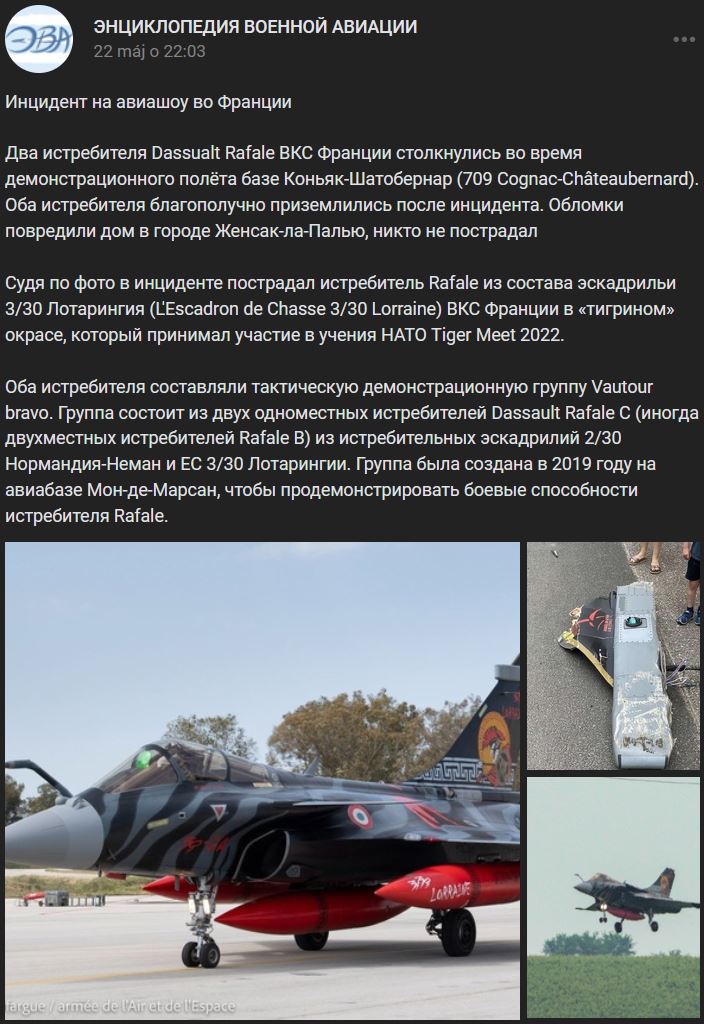 Nedeľa 22.05.2022, Francúzsko, letecká základňa Châteaubernard Air Base počas prevádzacieho letu vo vzduchu o seba "ťukli" 2 lietadlá Dassault Rafale C, registrácia 122/30-GA a 110/30-IN FR vzdušných síl. Obaja bezpečne pristáli a nik nebol zranený.