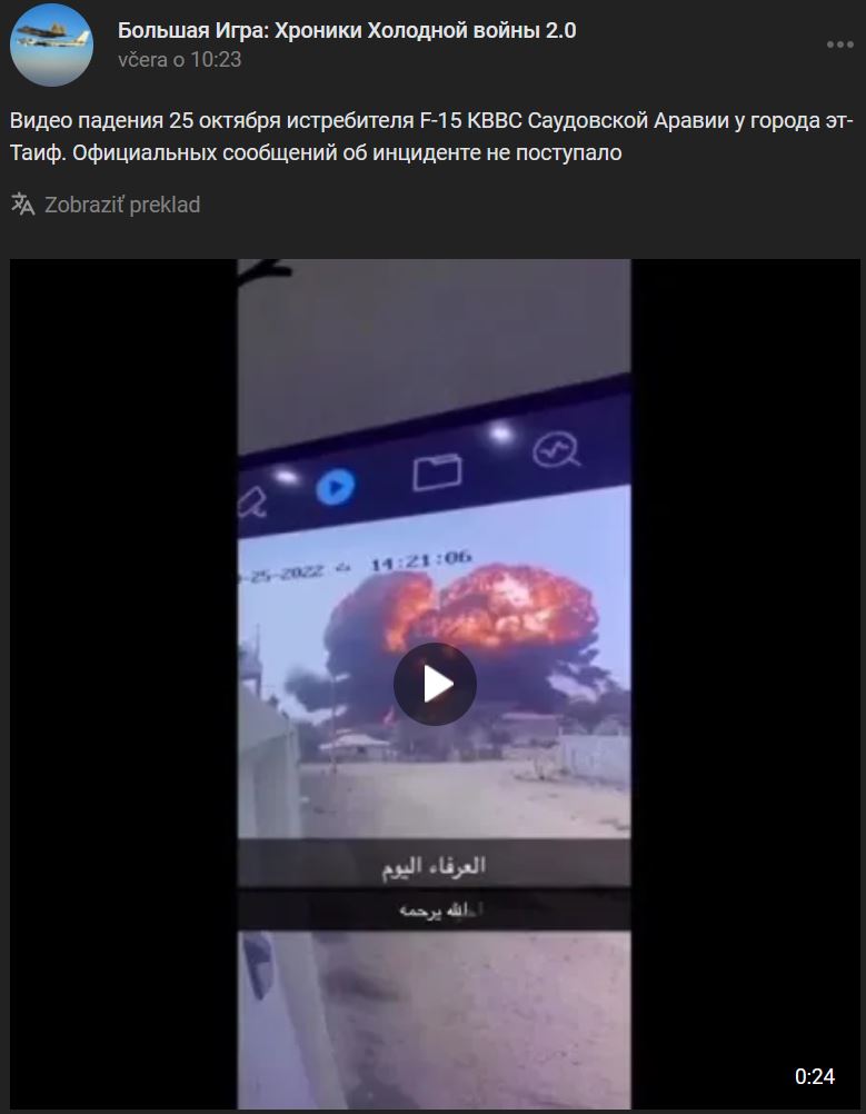 Video z havárie v utorok 25.10.2022 lietadla F-15 saudskoarabského letectva pri meste al-Taif. O incidente neboli podané žiadne oficiálne správy.