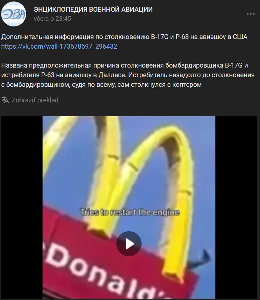 Možno najpravdepodobnejšia príčina zrážky bombardéra B-17G a stíhačky P-63 na leteckej prehliadke v Dallase. Zdá sa, že stíhačka sa krátko pred zrážkou s bombardérom zrazila s kopterom / dronom / BPLA