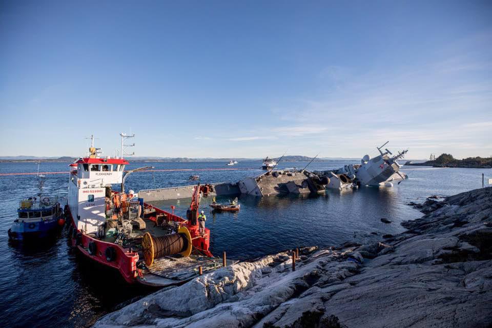 Nové fotky částečně ponořené fregaty KNM Helge Ingstad z norského námořnicta