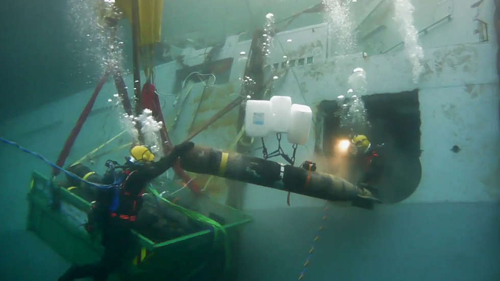 ↑ Časozberné video vyzdvihnutia + odľahčovanie lode zvnútra (vypúšťanie vody a kajút)