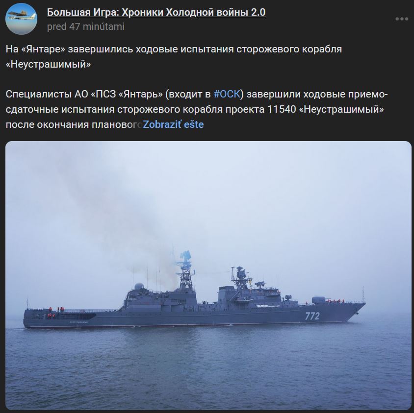 Pre informáciu: Vojnová loď "Neustrašimyj" je vlajkovou loďou projektu 11540. Bola postavená v lodeniciach Jantar v roku 1990 a od roku 1991 je súčasťou Baltskej flotily. Zdroj https://vk.com/wall-104764077_421222 / https://t.me/shipyardyantar/976 z 29.12.2022