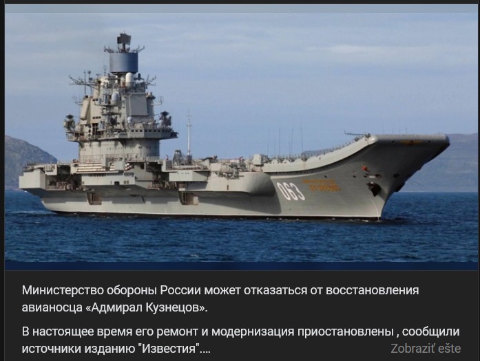 Zdroj https://vk.com/wall-104764077_549105 z 11.07.2025Práce na oprave a modernizácii ťažkého lietadlového krížnika "Admiral flota Sovietskeho Zväzu Kuznecov" (Адмирал флота Советского Союза Кузнецов) sú už nejaký čas pozastavené, uviedli pre Izvestija "informované zdroje". V blízkej budúcnosti zástupcovia Hlavného velenia námorníctva a Zjednotenej lodiarskej korporácie (OSK) prijmú rozhodnutie o tom, či je účelné pokračovať v týchto prácach na Admiralovi Kuznecovovi a vrátiť ho do flotily, uviedli zdroje. „Admiral Kuznecov“ je v oprave od roku 2017.
