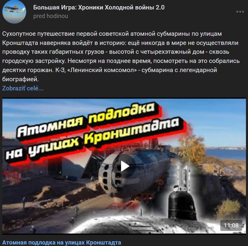 Pozemná preprava prvej sovietskej ponorky s jadrovým pohonom ulicami Kronštadtu (Кронштадт) sa určite zapíše do histórie: ešte nikdy na svete nebol takýto nadrozmerný náklad - vysoký ako 4-poschodová budova - sprevádzaný zastavanou časťou mesta. Napriek neskorej hodine sa naň prišli pozrieť desiatky obyvateľov mesta. K-3 "Leninskij komsomol" (Ленинский комсомол) je ponorka s legendárnym životopisom. Začala sa v čase vrcholiacej studenej vojny. V roku 1962 - ako prvá v histórii sovietskeho námorníctva - dosiahla severný pól a vynorila sa tam. Ukážka vojenskej sily ZSSR. A určite zohrala svoju úlohu pri riešení kubánskej krízy. Loď bola vyradená z námorníctva v roku 1991. Jadrový reaktor bol demontovaný a pripravený na likvidáciu na jednej z námorných základní Severnej flotily. Potom sa však rozhodli urobiť z ponorky hlavný exponát Múzea námornej slávy, ktoré sa v súčasnosti buduje v Kronštadte. Z Murmanskej oblasti ju odtiahli do lodenice a potom ju renovovali. Potom ju naložili na špeciálnu bárku a dopravili na breh. Dĺžka A-ponorky je 107m, jeho šírka je takmer 8m a ponor je o niečo menší ako 6m. Pri takýchto rozmeroch nebolo možné ponorku vyložiť priamo z vody do špeciálne postaveného suchého doku, pretože hĺbka Fínskeho zálivu by to nedovolila. Preto sa rozhodlo, že ponorka bude na miesto večného odpočinku prepravená po súši. Je to posledný úsek trasy, jedinečná inžinierska a logistická operácia. Jazda celou 107m dlhou ponorkou úzkymi uličkami starého mesta bez toho, aby ste sa dotkli budov na zákrutách, je nerealizovateľná. Preto bol trup rozdelený na 2 časti. Najprv zadná a potom predná časť. Špeciálny náklad bol položený na špeciálnej samohybnej plošine s 240 kolesami, po uliciach mesta sa pohyboval rýchlosťou približne 5km/h. Aby mohol kolos s ponorkou prejsť cez cesty v Kronštadte, muselo sa demontovať desiatky semaforov a cestných stavieb, vyrúbať stromy na ceste a na niektorých miestach dokonca rozšíriť vozovku. Organizátori operácie sľubujú, že všetko obnovia. Keď loď zaujme svoje miesto v múzeu, bude tiež obnovená. V lokalite "Ostrov Fortov" (Остров Фортов) sa uskutoční slávnostné podujatie pri príležitosti ukončenia poslednej cesty K-3 na miesto večného odpočinku. Obe časti ponorky budú zvarené dohromady. V lete 2023 bude na palube ponorky K-3 "Leninskij komsomol" otvorené múzeum vojenskej slávy. Zdroj https://vk.com/wall-104764077_394836 z 21.10.2022skflanker_ píše: ↑09 lis 2021, 20:41Dokument o prvej ruskej A-ponorke K-3 a o jej terajšom transporte do nového múzea...