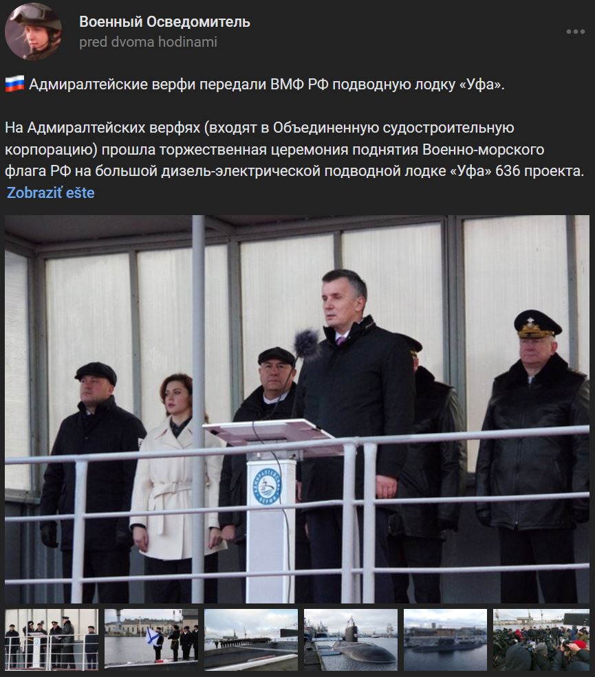 V Petrohrade v Admiraltejskij lodeniciach (Адмиралтейские верфи) na vodu spustili D-E ponorku projektu 636 pomenovanú po meste "Ufa". Ponorka je hotová na 90%, po úplnom dokončení sa začnú závodné testy. "Ufa" je 4. ponorka projektu 636 pre TOF, založená v 10/2019. V lodenici prebieha výroba na 5. ponorke pre TOF "Možajsk" (Можайск) a na 6. ponorke "Jakutsk" (Якутск) Zdroj https://www.aoosk.ru/press-center/news/ ... lodku-ufa/ + klon https://vk.com/wall-104764077_310338 z 31.03.2022 + viac foto