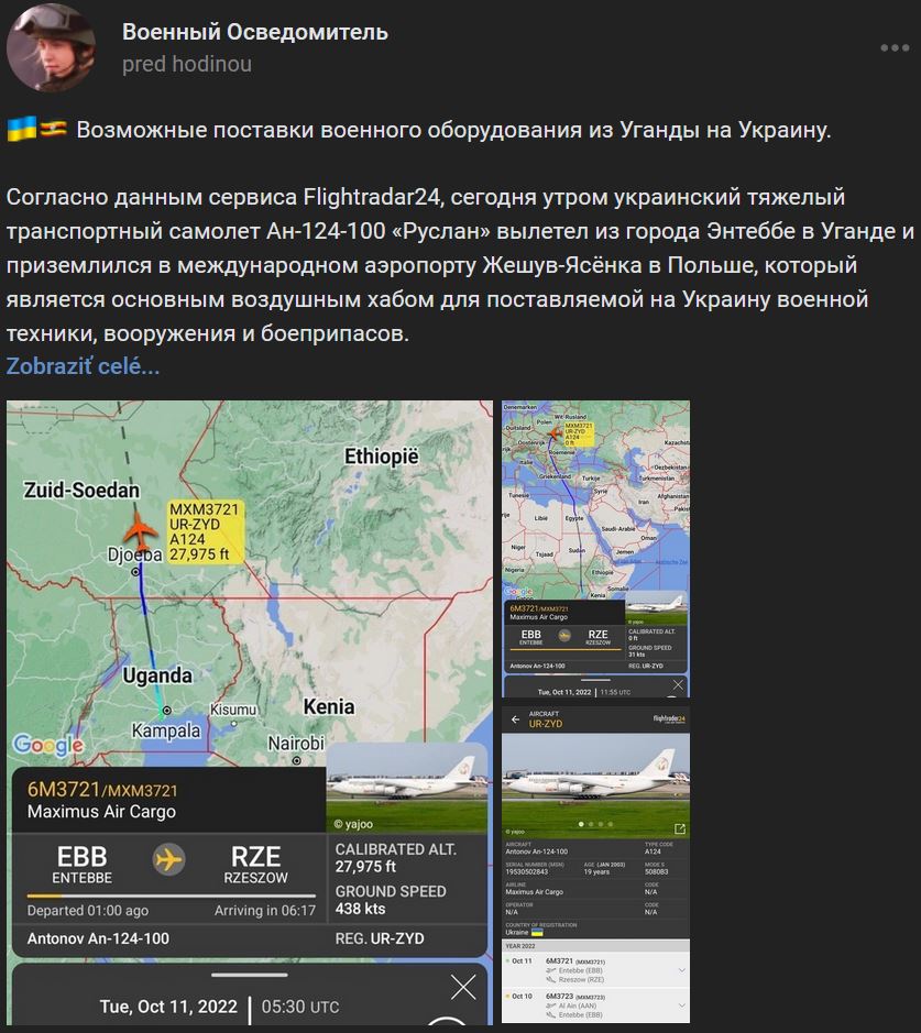 Podľa služby Flightradar24 ukrajinské ťažké dopravné lietadlo Antonov An-124-100 Ruslan (Ан-124-100 Руслан) v utorok 11.10.2022 ráno odletelo z Entebbe v Ugande a pristálo na medzinárodnom letisku Rzeszow-Jasieńka v Poľsku, ktoré je hlavným leteckým uzlom pre vojenský materiál, zbrane a muníciu dodávanú na Ukrajinu. Podľa otvorených zdrojov má ugandská armáda niekoľko desiatok kusov sovietskej techniky vrátane tankov T-72 a T-55, BMP-2 (БМП-2), BTR-60 (БТР-60), 122 mm diel D-30 (Д-30) a raketometov Grad (Град), ako aj zásoby munície pre ne. Okrem toho boli do Ugandy z Ruska dodané tanky T-90S (Т-90С) a obrnené transportéry BTR-80A (БТР-80А), ako aj lietadlá Su-30MK2 (Су-30МК2) ... Tento podivný let ukrajinského Ruslana z Ugandy, krajiny s veľkými zásobami sovietskej výzbroje, na poľské letisko, ktoré je hlavnou zásobovacou základňou pre Ukrajinu, ktorá potrebuje sovietsku výzbroj, vyvoláva naše vážne obavy z možného zapojenia Ugandy do tohto konfliktu na strane VSU. Zdroj https://vk.com/wall-123538639_3107338 / https://t.me/milinfolive/91724 z 11.10.2022