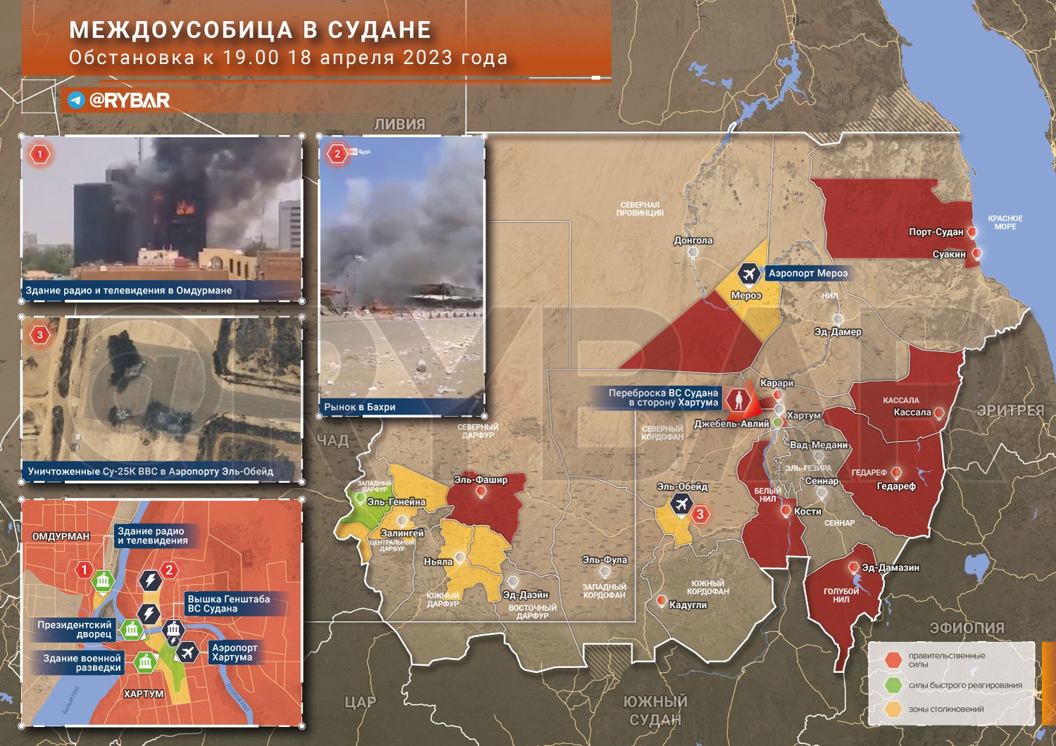 Podle velení súdánské armády se RSF pokusily zmocnit sídla generálního velitelství ozbrojených sil země. Uvádí se také, že letiště Meroe se dostalo pod plnou kontrolu Sil rychlé podpory, včetně egyptských letadel, která byla zabavena. Podle Sky News Arabia dochází k rozsáhlému rozmístění armádních sil v blízkosti prezidentského paláce v Chartúmu. Letiště v hlavním městě nyní pozastavilo lety, přičemž některým z nich již byl odepřen nástup na palubu.