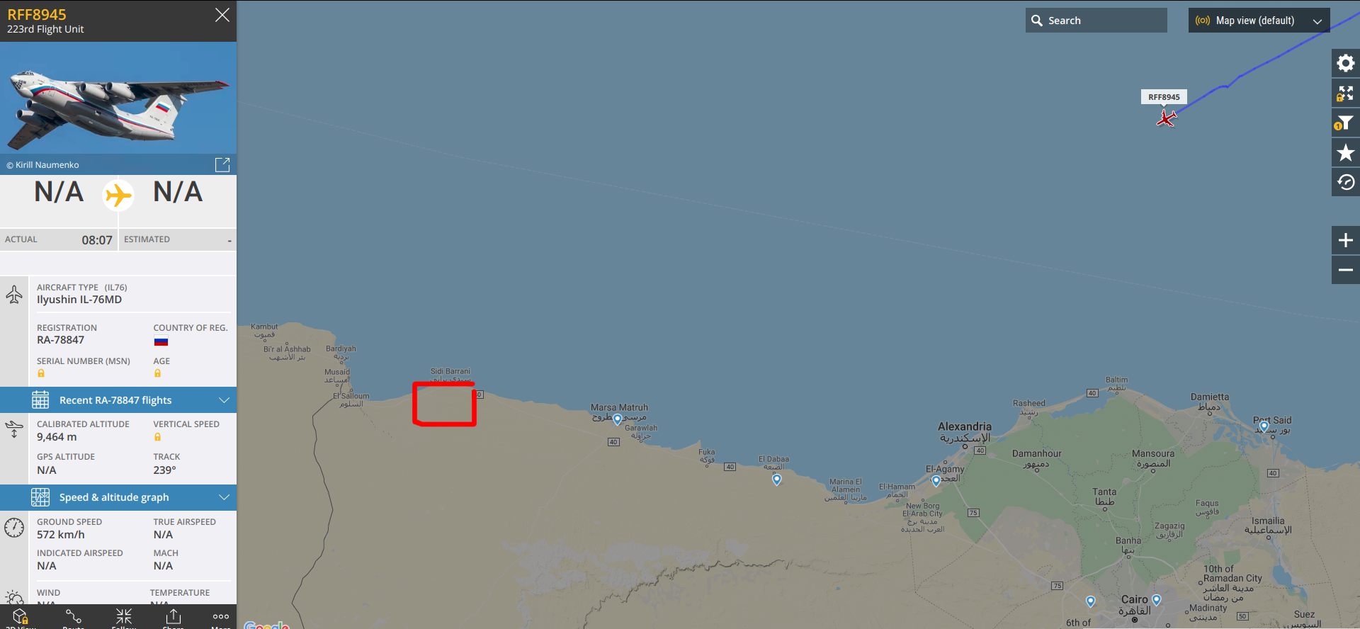Il-76MD RA-78847 z Hmímimu (včera přiletěl z Mozdoku přes Turecko) letí buď na leteckou základnu Sidi Barrani v Egyptě (zatím drží kurz přesně na ni) nebo někam do Libye či dál na západ. Vypnul odpovídač a zmizel.