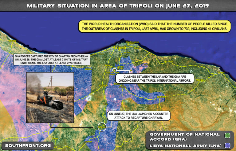 Síly loajální vládě národní dohody (GNA) obsadily strategické město Garyan jižně od hlavního města země, Tripolis, od Libyjské národní armády (LNA) po překvapivém útoku v pozdních hodinách 26. června. Libyjské zdroje sdělily RT, že GNA síly zaútočily na Garyan ze dvou směrů a byly schopny určit pozice LNA uvnitř města s podporou tureckých bezpilotních vzdušných prostředků (UCAV). Pozdněji pro-GNA spící buňky ve městě začaly napadat vojska armády tak si vynutit jejich stažení. Desítky vojáků LNA bylo údajně zajato GNA silami, zatímco několik dalších bylo zabito nebo zraněno. Armáda také ztratila nejméně sedm vojenských vozidel.