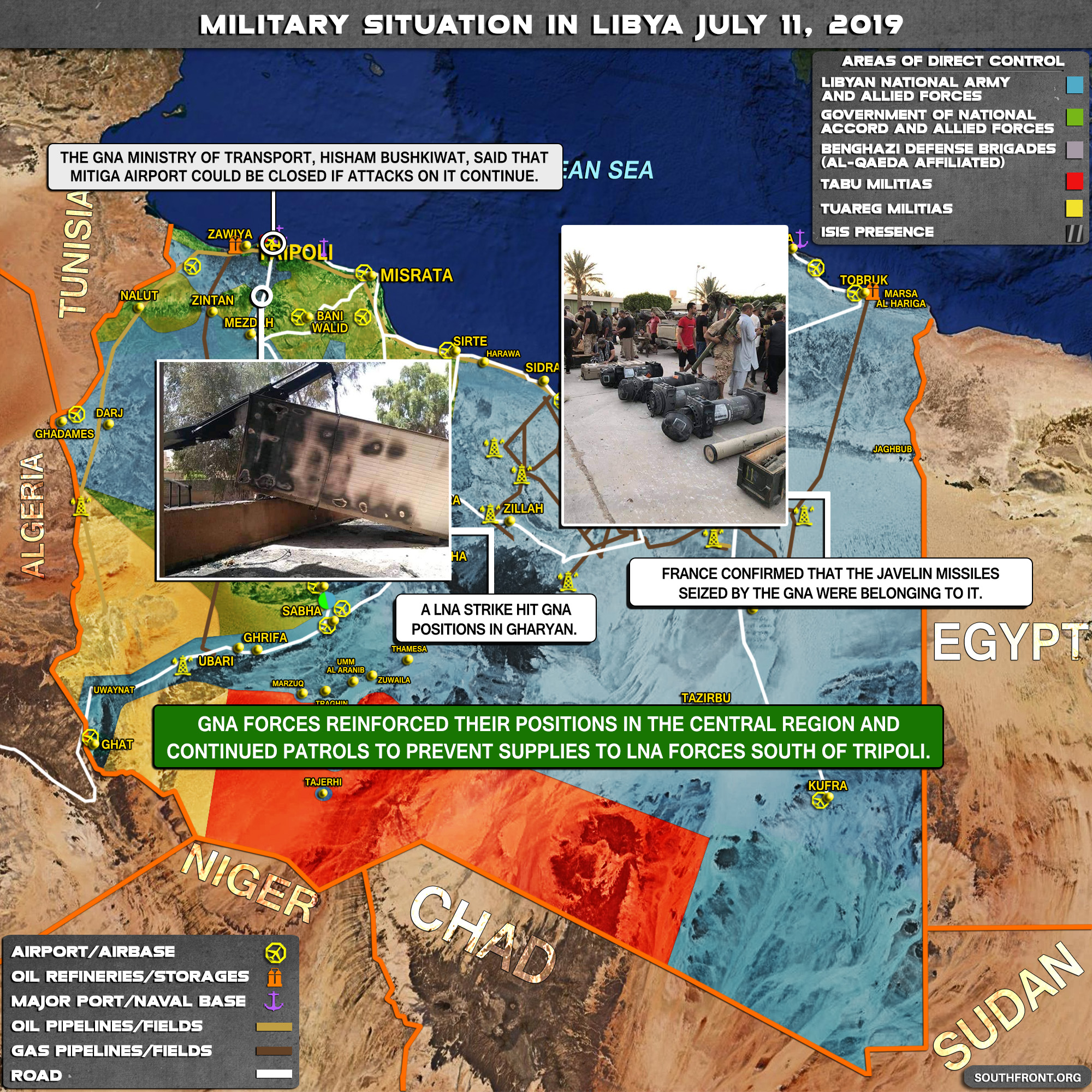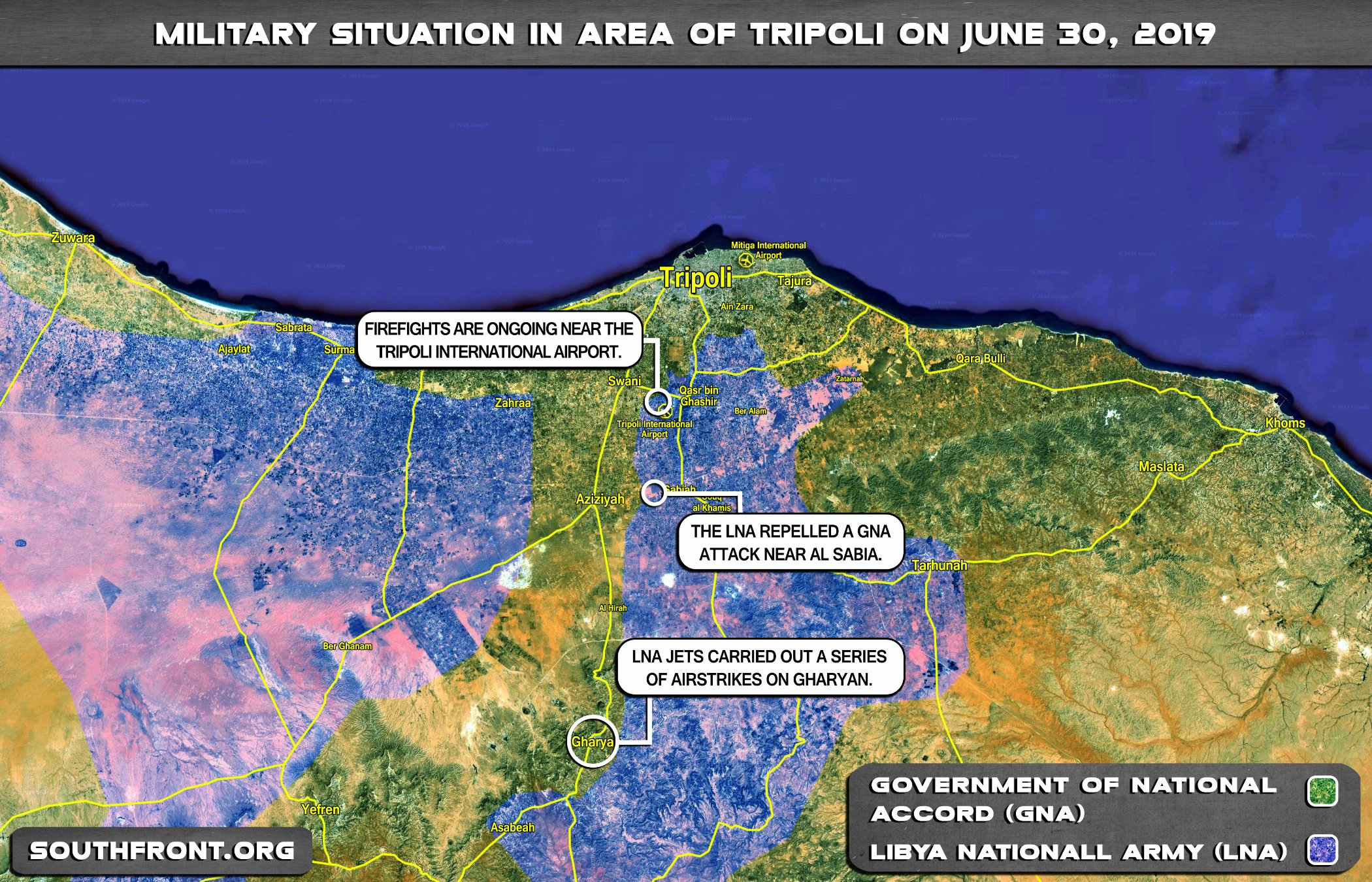 LETADLA libyjského letectva (LAF) provedla sérii náletů na síly loajální vládě národní dohody (GNA) ve strategickém městě Garyan jižně od hlavního města země, Tripolis, v časných ranních hodinách června 29. Televize al-Džazíra sdělila, že nálety útočily na vojenský tábor al-Thamina a jiné pozice ve městě. Podle informací se letectvo pravděpodobně zaměřilo na množství pokročilých zbraní které tento týden obdržely síly GNA. Síly GNA předvedly některé ze získaných zbraní 27. června a ukázaly, že obsahovaly alespoň čtyři US-vyrobené FGM-148 Javelin protitankové řízené střely (ATGM).