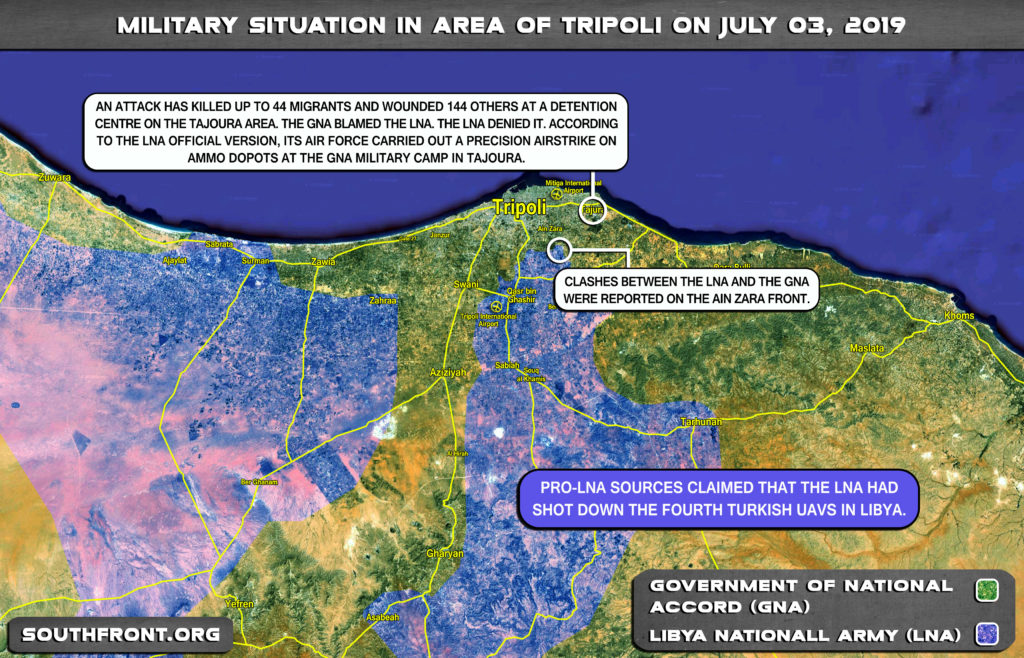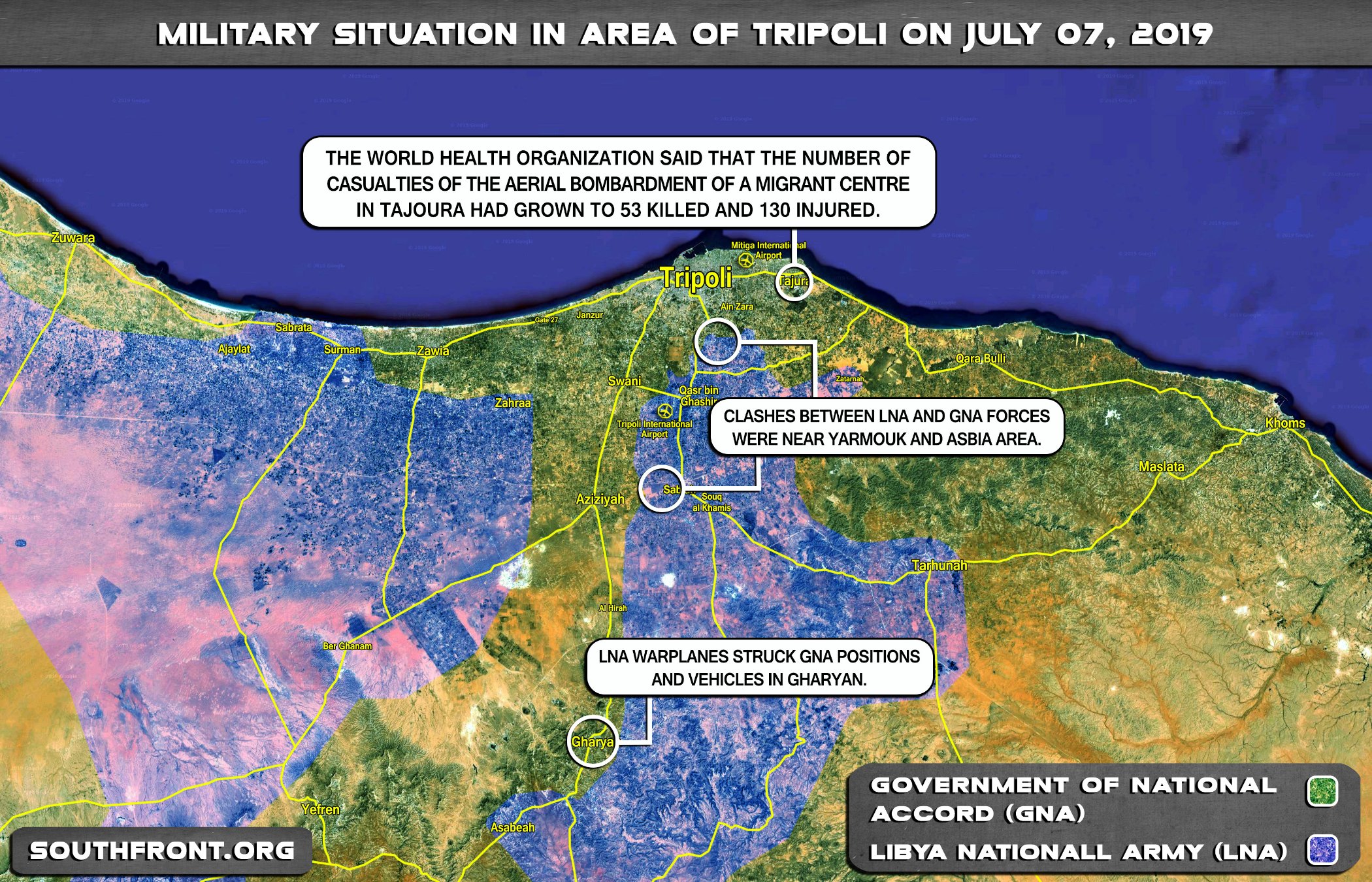 Světová zdravotnická organizace uvedla, že počet obětí leteckého bombardování střediska migrantů v Tajoura vzrostl na 53 mrtvých a 130 zraněných. https://southfront.org/military-situati ... ap-update/