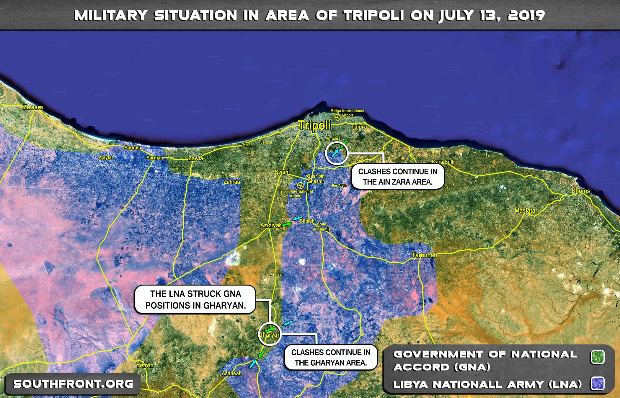 Libyjská národní armáda (LNA) obnovila své pozemní operace 19. července a obsadila vojenskou základnu v okrajové části hlavního města země Tripolisu. Základna známá jako tábor al-Yarmouk, se nachází méně než 7 km jižně od centra Tripolisu. Televize al-Arabiya uvedla, že jednotky LNA byly schopny obsadit základnu po těžkých střetech se silami loajálními vládě národní dohody (GNA). Tábor Al-Yarmouk střeží silnici spojující města Qasr bin Ghashir a Khallet Alforjan, což z ní činí jednu z klíčových vojenských pozic v okolí Tripolisu. Po revoluci v roce 2011 byl vojenský tábor obsazen brigádou pro-GNA Tripolis Revolutionaries Brigade. LNA v současné době pracuje na zabezpečení tábora, protože oblast kolem něj je stále svědkem některých střetů, podle al-Arabiya. Pokud by v tom armáda uspěla, mohla by se během několika dnů dostat do okresu Saladin v jižní části Tripolisu.